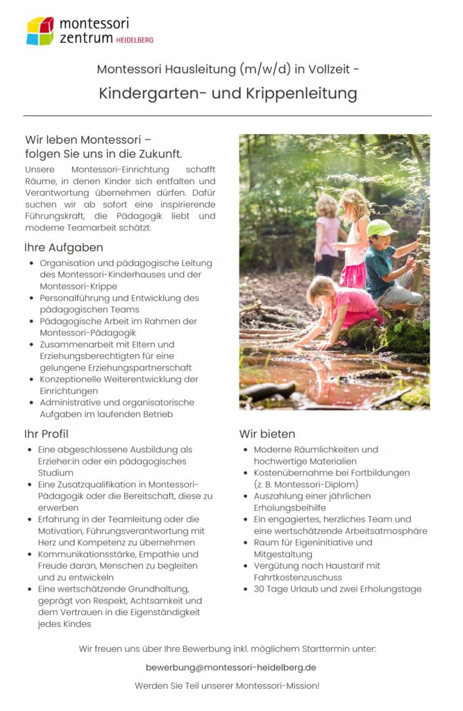 Montessori Hausleitung (m/w/d) Vollzeit, Kindergarten- und Krippenleitung, Kinderhaus am TurmVon Susanne Kraus / 6. November 2025